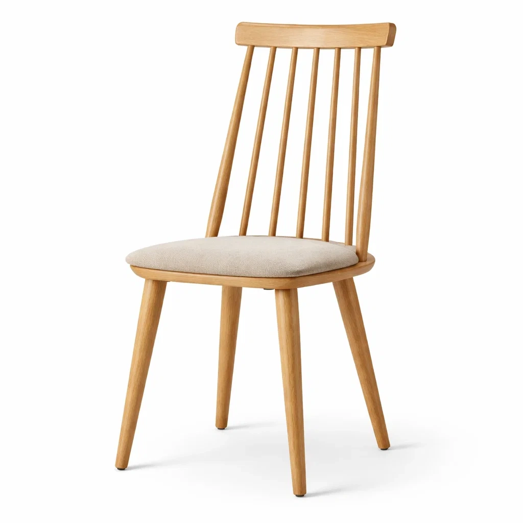 Chaise avec structure en bois de chêne massif et assise rembourrée de mousse avec revêtement en tissu polyester beige.