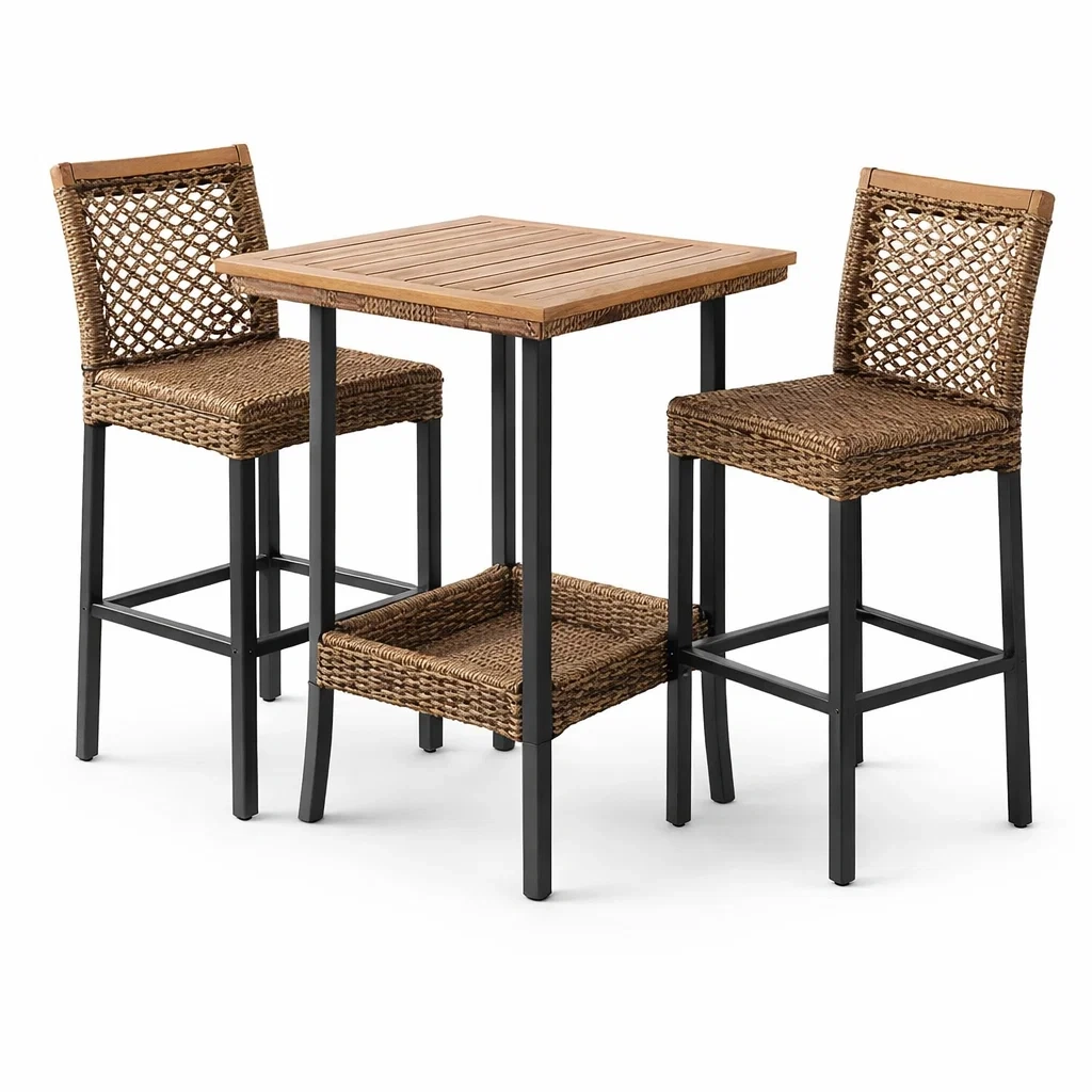 Ce set comprend une table haute et deux chaises. Le plateau de la table est en bois d'acacia avec des pieds en acier noir. Les chaises sont en rotin synthétique avec une structure en acier noir.